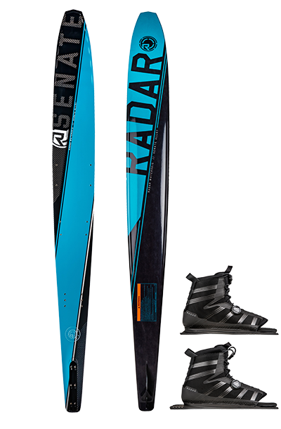 The Senate’s ability to carry speed is unmatched in the industry. This speed allows the skier to maintain width on the boat ultimately giving a sense of freedom sought after by those that ski in the course as well as those ripping open water turns. By taking our Vapor shape and adding two tenths of an inch in extra width we have created a stable riding platform. This platform creates the balance needed for a skier to feel at home, while the profile of the ski allows the skier to feel the speed and angle sought after at any level.